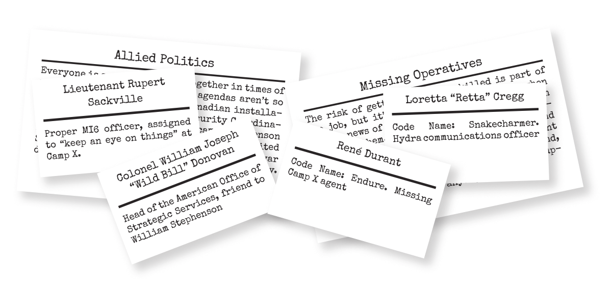 Everyone is supposed to work together in times of war—but in reality, political agendas aren’t so easily forgotten. Camp X is a Canadian installation, but as chief of British Security Coordination as well as commander of the camp, Stephenson is beholden to the Crown. Meanwhile, the United States is gaining greater influence in the war due to resources and at the camp due to proximity. The war-weariness and caution of the Brits must be balanced with the impatience and determination of the Americans in every operation, and agents will negotiate the same politics in their own cells. Agents’ “home” organizations will have “friendly” requests that suit their own agendas, and how operatives respond will affect their relationships with superiors.