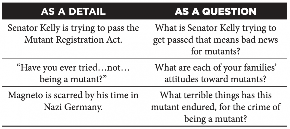 Some of these are better off as details given to the players, others as questions that the players can answer on their own. Some questions might even be asked several times during a single campaign, each answer adding something new to the story. Mixing and matching details and questions is encouraged, since these details will often vary in how specific they’ll need to be and in how much direct control you’ll want over them.