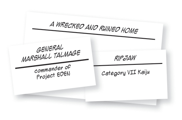 To create your own Kaiju, start with a High Concept that gives the monster a category based on its size (you don’t want to go lower than Category III) and outlines its special abilities. Give it a few more aspects and a Weakness, which should be a part of its physiology susceptible to attack. Then assign it a number of skills equal to its Category plus one. Build stunts using the mecha-stunt rules (page 42) with a number of slots equal to its Category. For example, the Electricity Glands stunt of the Howler Kaiju takes up two stunt slots to get a bonus and a weapon rating of 2. Give it a number of stress boxes equal to its Category and the normal run (mild, moderate, severe) of consequences.